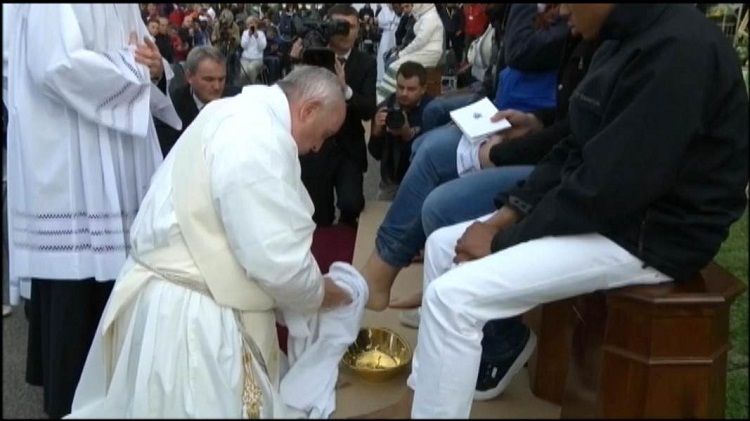 Исто како што Исус, како што пишува во Евангелието, ги миел нозете на своите ученици, така тоа го прави и Папата во ритуалот на обележување на смртта и воскреснувањето на Велики Четврок.