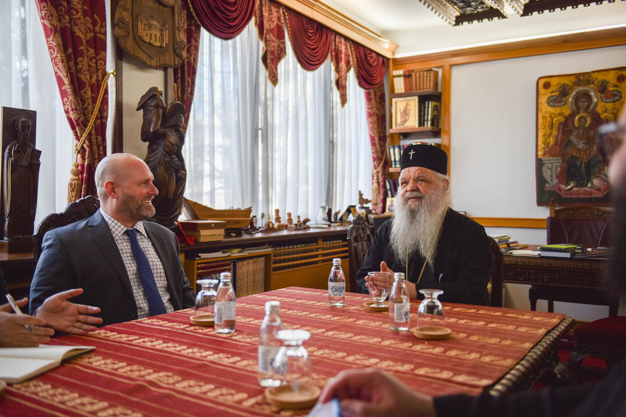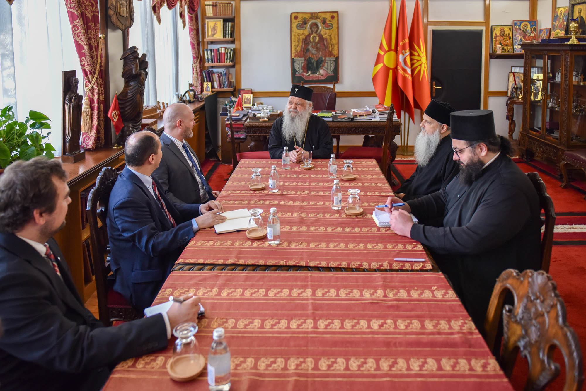 Тие заедно со политичкиот советник на американската амбасада во Скопје, Ендрју Ковтун и политичкитот аналитичар на амбасадата, Адриан Ислаили, вчера биле на средба со архиепископот Стефан во Архиепископијата. На средбата бил и секретарот на Синодот, епископот Херајлејски Климент, и шефот на кабинетот на архиепископот Даниел Јовановски.