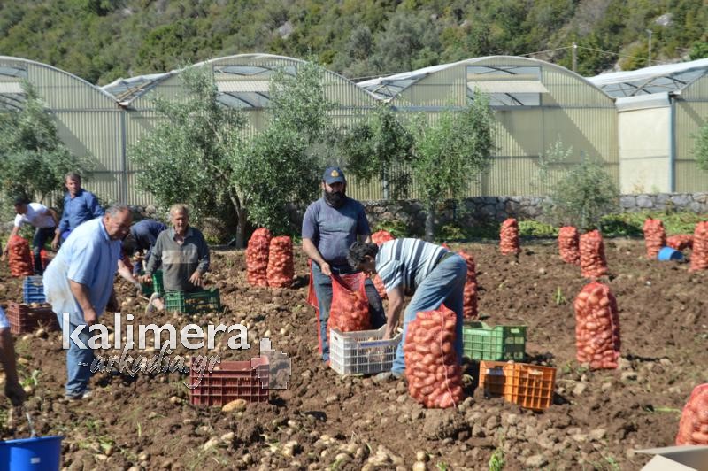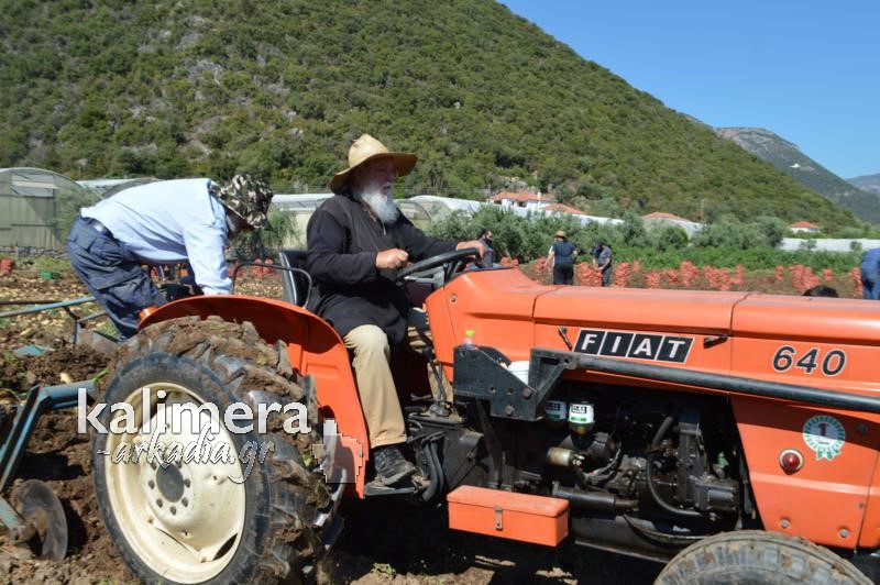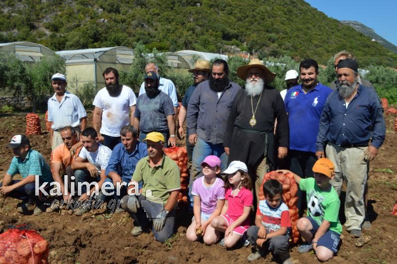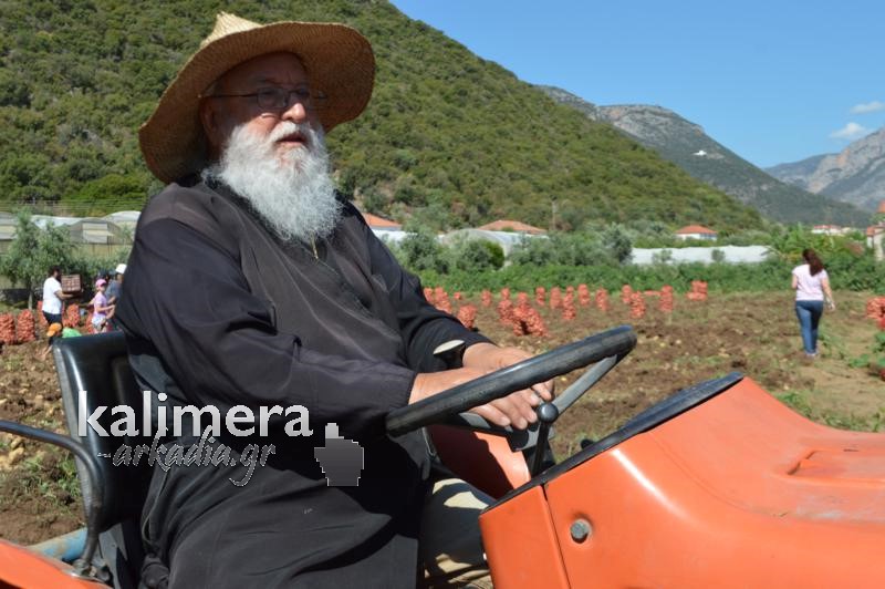 Митрополитот Александар од нивата, имот на манастирот „Св. Николај“ во Леонидио во Грција собра речиси шест тони компир. Качен на трактор помогна во вадењето на родот.