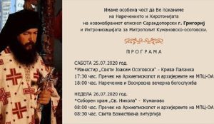 Во манастирот „Св. Јоаким Осоговски“ денеска од 18 часот ќе се изврши наречението за епископ на архимандрит Григориј, игуменот на Осоговскиот манастир, а утре на празникот посветен на архангел Гаврил, во Соборниот храм „Св. Николај Чудотворец“ во Куманово од 8:30 часот ќе биде отслужена Света Божествена литургија, на која ќе биде хиротонисан за епископ сарандопорски.